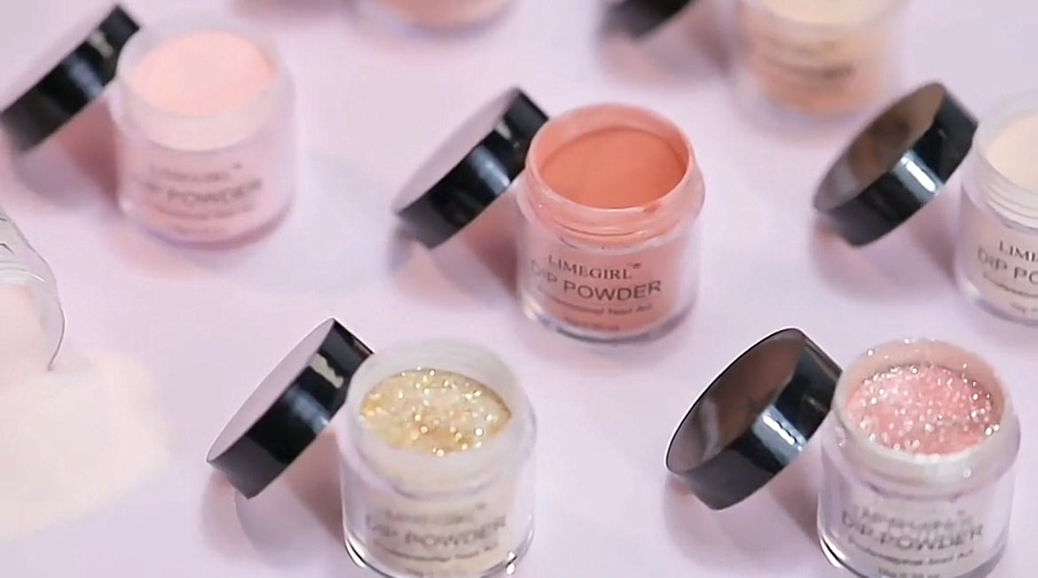 Applicera baslacket på nageln och doppa försiktigt fingret i pudret.